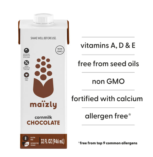 Powered by corn fiber for gut health, Maïzly is fortified with vitamins A, D, E, and calcium. It's gluten-free, allergen-free, has ¼ the sugar of dairy milk, and is free from seed oils, making it a healthy, nourishing choice.