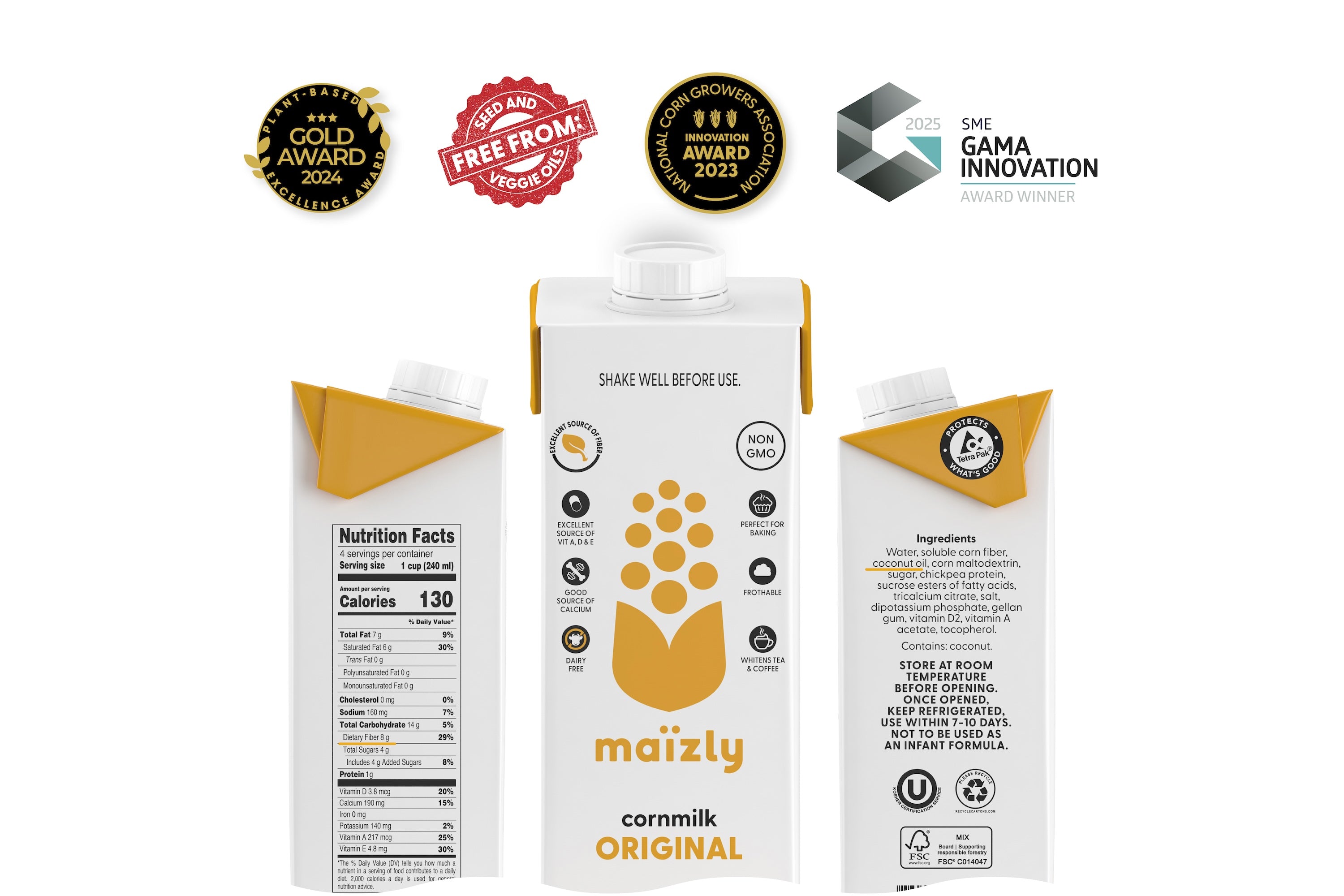 Made with corn—the world’s most abundant crop—Maïzly minimizes water and land use, reduces food miles, and revitalizes soil health, setting a gold standard for eco-friendly production.