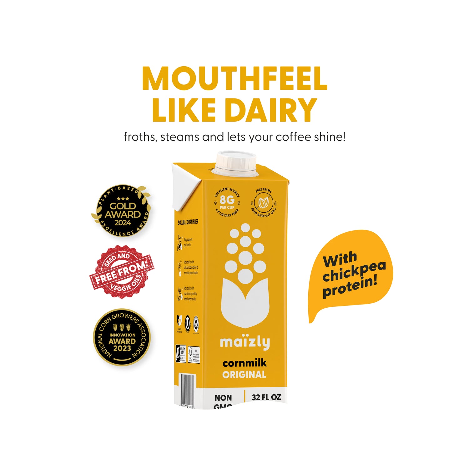 The world's first non GMO cornmilk alternative crafted with sustainability at its core. With its smooth, dairy-like mouthfeel and naturally light taste, it’s a perfect match for coffee, cereal, smoothies, baking, or simply enjoyed on its own. Packed with soluble corn fiber to support gut health, and promote digestion, Maïzly Original isn’t just delicious—it’s nourishing, too. Really made for all!